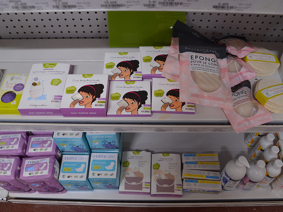 Pour éviter de gaspiller des ressources, le zéro déchet vise à utiliser des produits à usage unique : cotons démaquillants, protège-slip lavables, disques nettoyant et exfoliants, éponges, bouteilles, etc. La boutique Merveilles de la nature a un rayon entièrement consacré à cette tendance du zéro déchet.